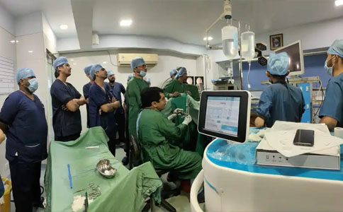 本次手術演示是活動的核心環節,Dr. Rohit Joshi醫生憑借其精湛的手術技巧,結合普東醫療160W鈥激光系統的卓越性能,向與會專家展示了一場高水平的HOLEP手術演示。Dr. Joshi在手術過程中靈活運用普東醫療160W鈥激光的多種模式,實現了對組織的高效剝離和精準止血